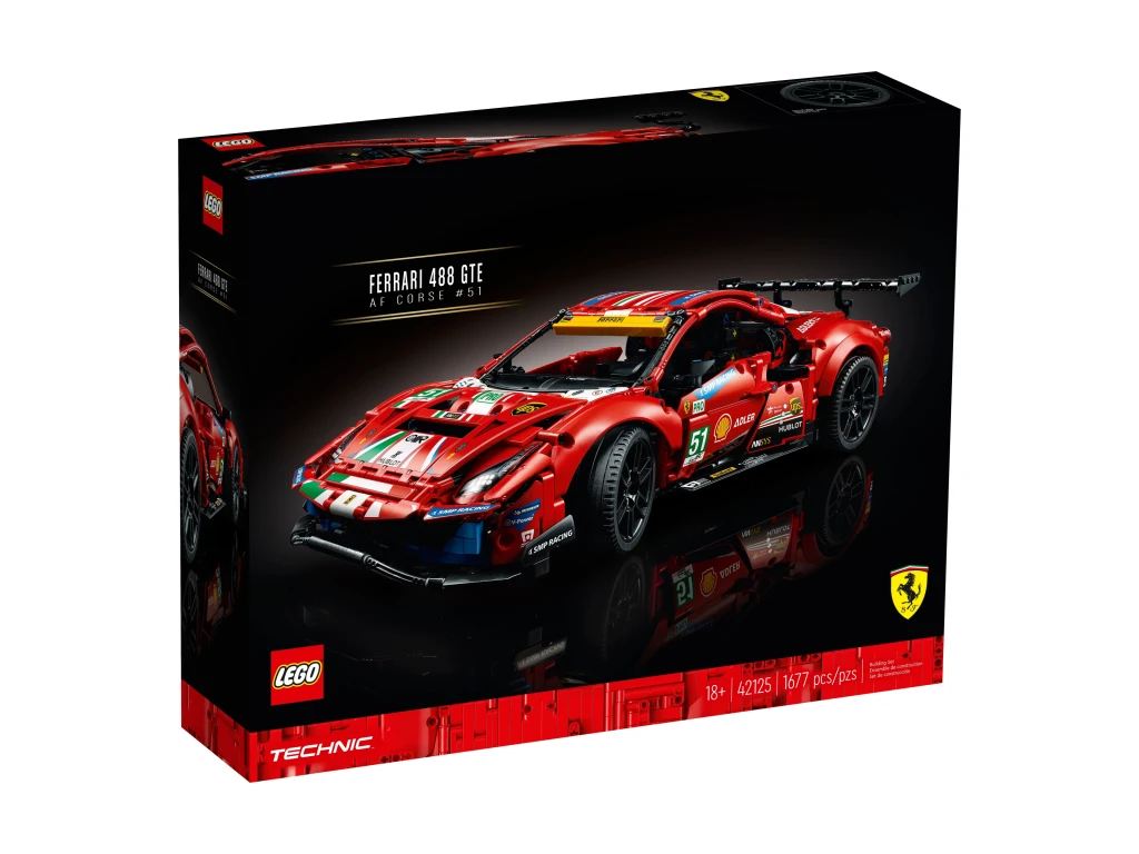 LEGO 42125 Ferrari 488 GTE AF Corse #51 to zaawansowany zestaw z serii Technic, stworzony z myślą o fanach motoryzacji i konstrukcji realistycznych modeli. Zestaw odwzorowuje słynny samochód wyścigowy klasy GT, zawierając szczegółowe elementy, takie jak działające zawieszenie, realistyczny silnik V8 z ruchomymi tłokami, kierownicę działającą na koła oraz wiernie oddane detale nadwozia. Ten model to idealna propozycja dla kolekcjonerów i miłośników sportowych maszyn.